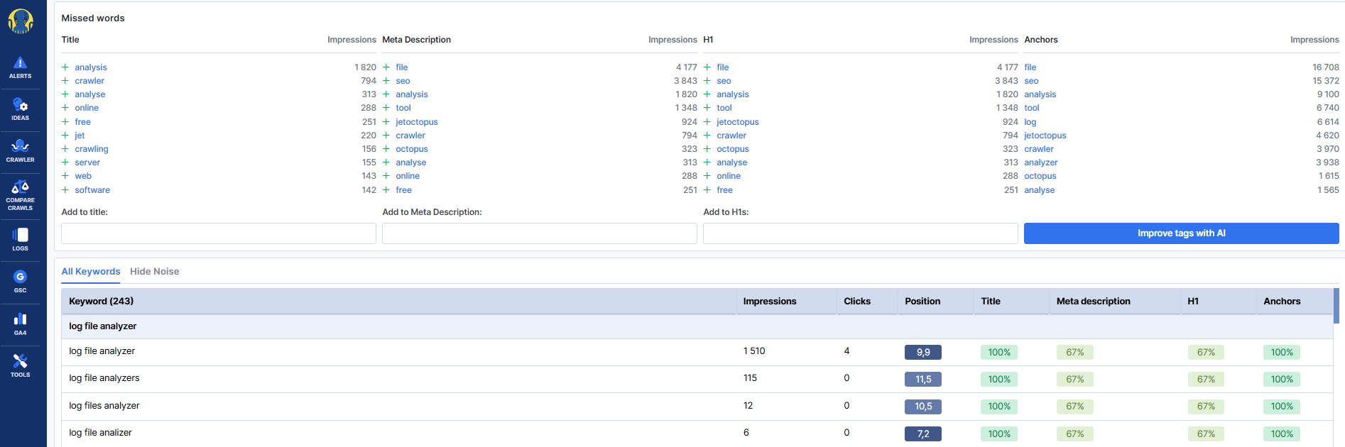 Our AI-powered content analysis tool helps identify keyword gaps, optimize metadata, and improve relevance for any landing page. The system analyzes titles, meta descriptions, H1s, anchor texts, and the keyword sets your URL is already ranking for, providing data-driven optimization recommendations.