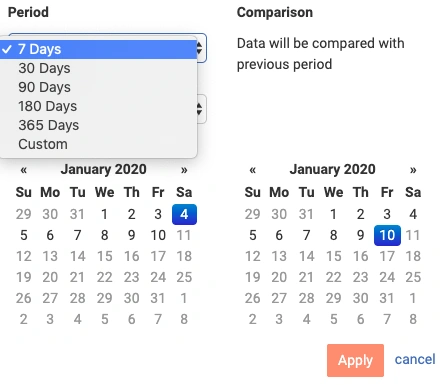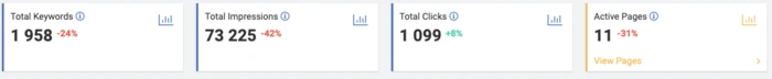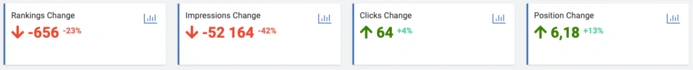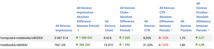 Pick up the necessary information from the current period and then compare it with the previous one. Know the exact percentage change (impressions, clicks, CTR, active pages, rankings).