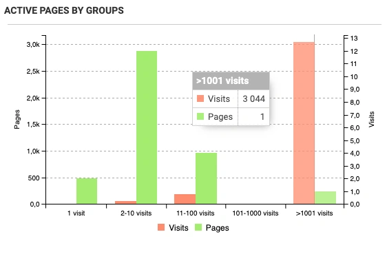 I personally love the “Active Pages by Groups” chart. This chart reveals how many pages bring you the most traffic. In this particular case, you should be able to see that 410 pages bring more than 2.5 million visits. It makes sense to add a segment for these pages and to care for them separately. We should also examine these pages more closely so we can justify the efficiency of these pages and propagate the results to other pages.