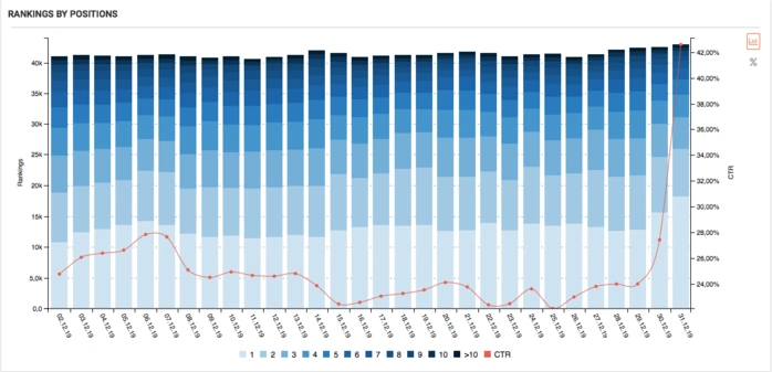 This graph shows a very absorbing picture of your rankings. The area of the bars that are shaded in dark blue represent the worst-case scenario while the area of the bars that are shaded in light blue represent the best-case scenario.