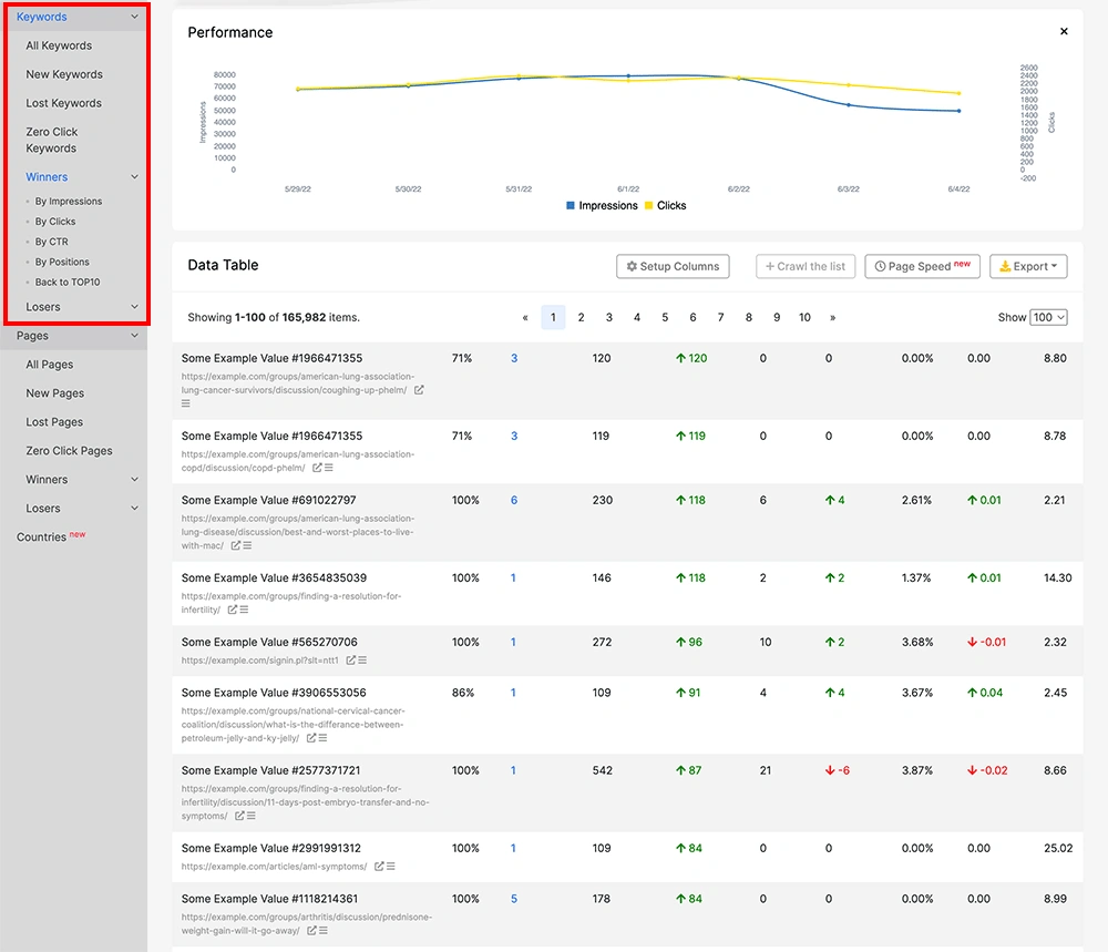 by impressions/clicks/CTR/positions and with drop by