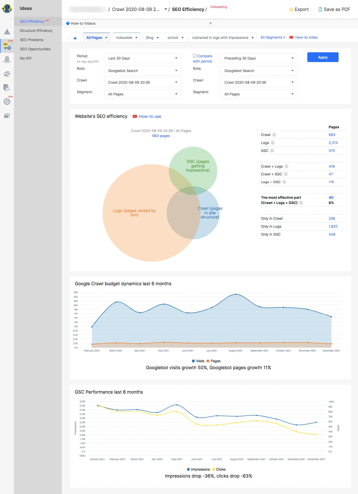 This screenshot below shows the list of directories present on the website, the pages in this directory, the percentage of indexable pages, the average number of internal links to a page within this directory, bot’s behavior here, SERP impressions, and clicks. It also shows the SEO efficiency by directories to analyze and multiply the positive experiments.