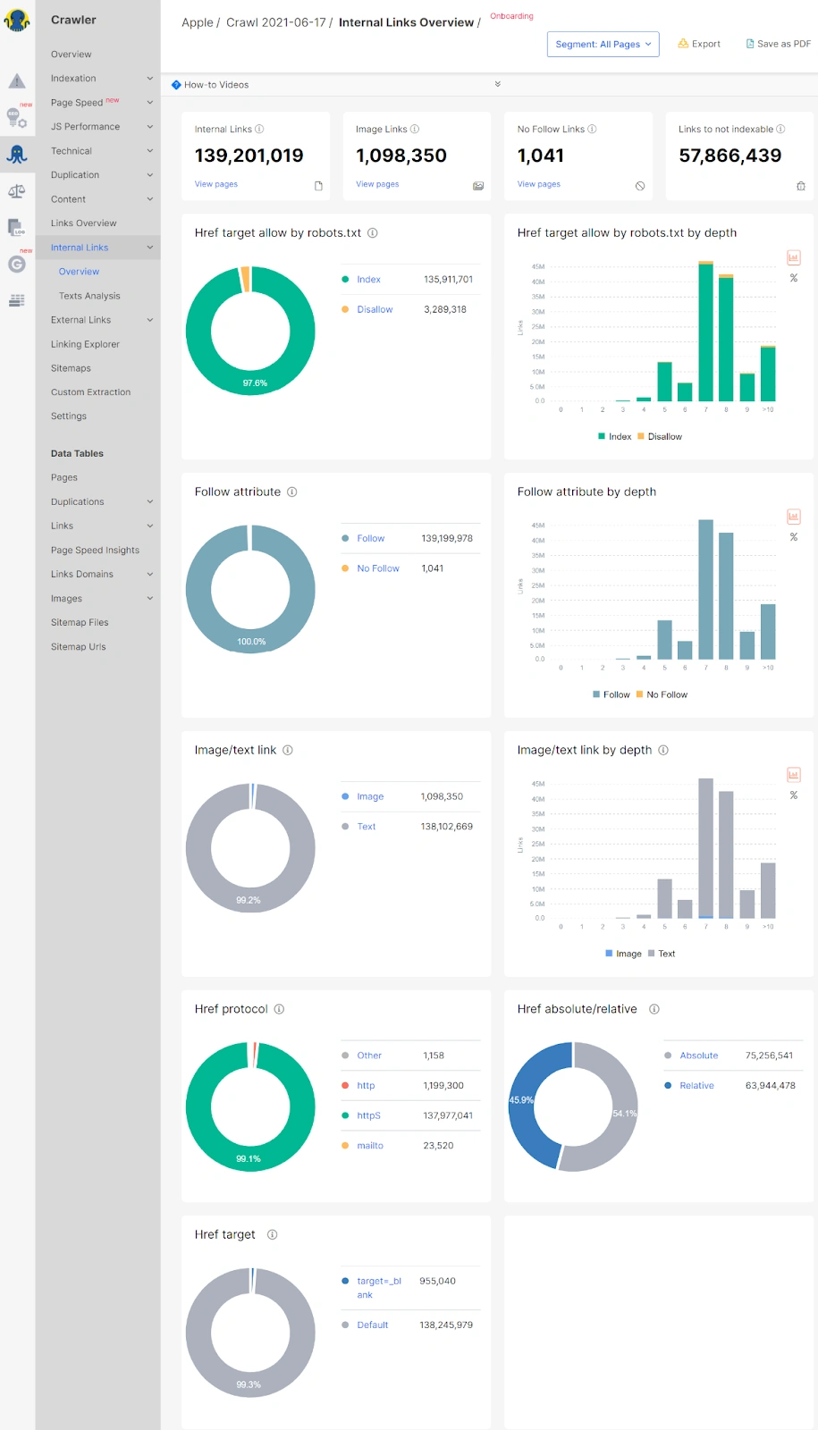 Therefore, before you add more pages to your site, it’s advisable to audit its internal linking. When you crawl your website site in JetOctopus Site Audit tool, you will see two reports of internal linking in the dashboard.
