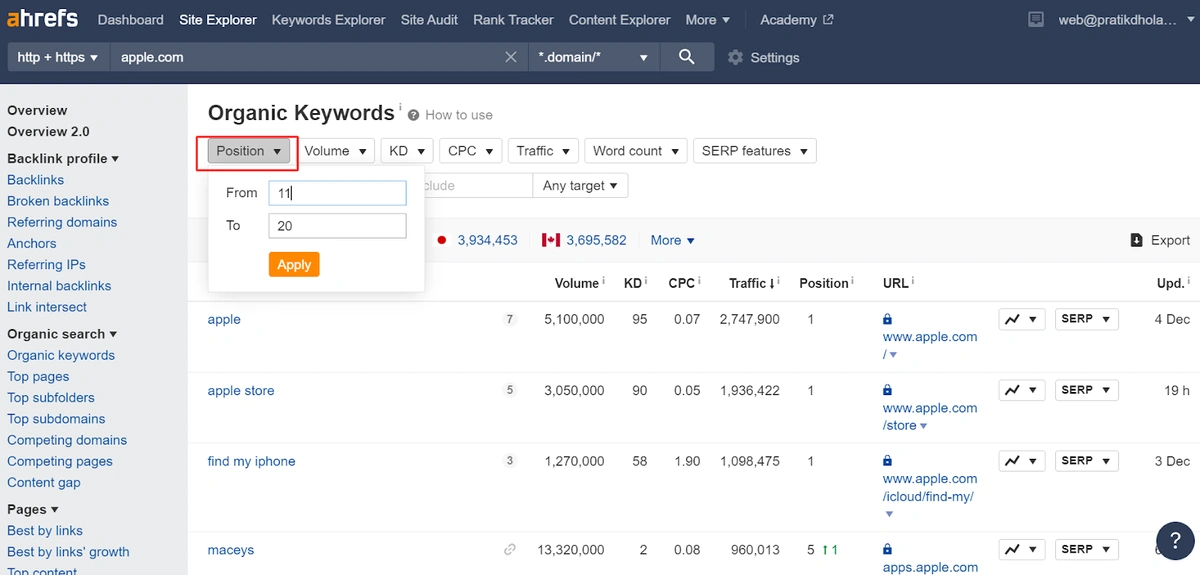Just enter your domain and go to the Organic Keywords. Enter 11 to 20 in the Position and you will get a list of striking distance keywords.