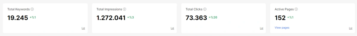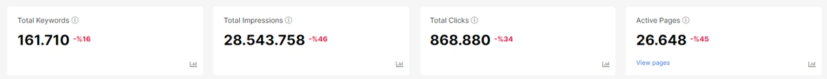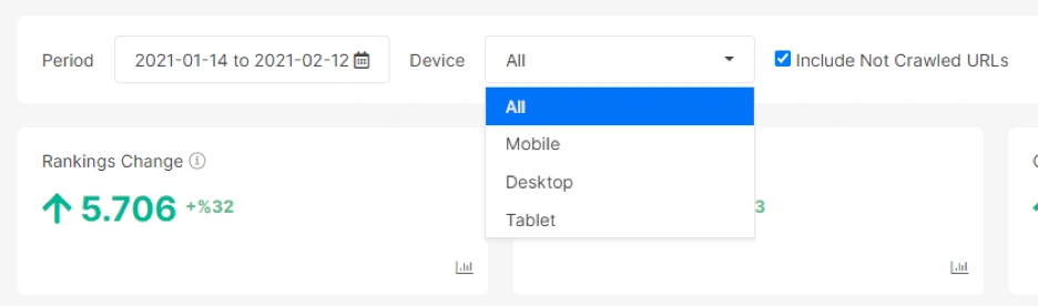 At the top of the section, there is a board that includes the overall situation for these keywords. And, there is of course device based and date based filtering options. Below, you will see another overall data board from just the All Pages section.