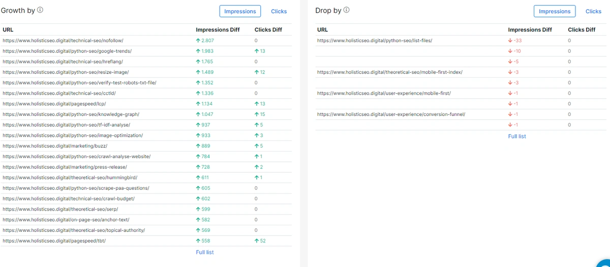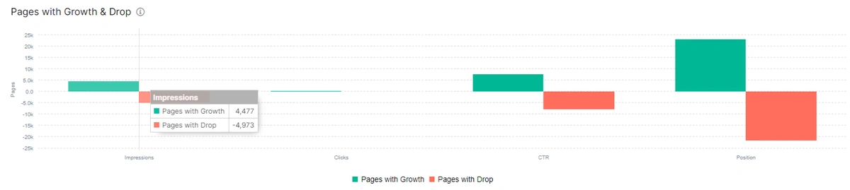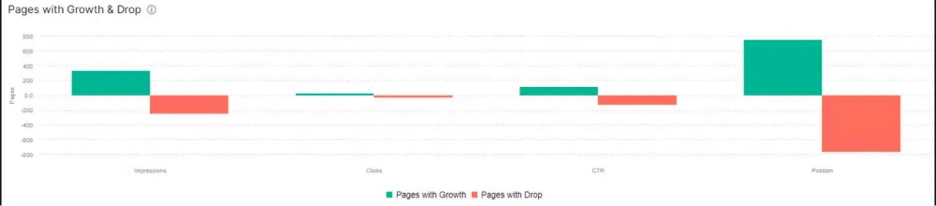 Pages with growth and drop sections show the pages with a better and worse organic performance according to the previous period. Below you will see the pages with positive and negative changes in terms of impressions, clicks, CTR and positions.