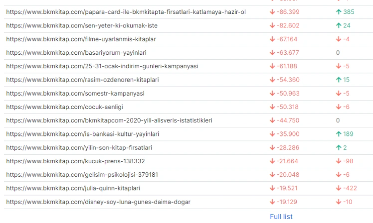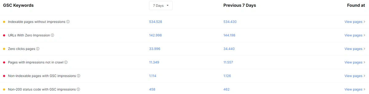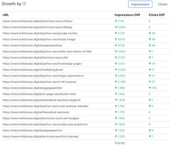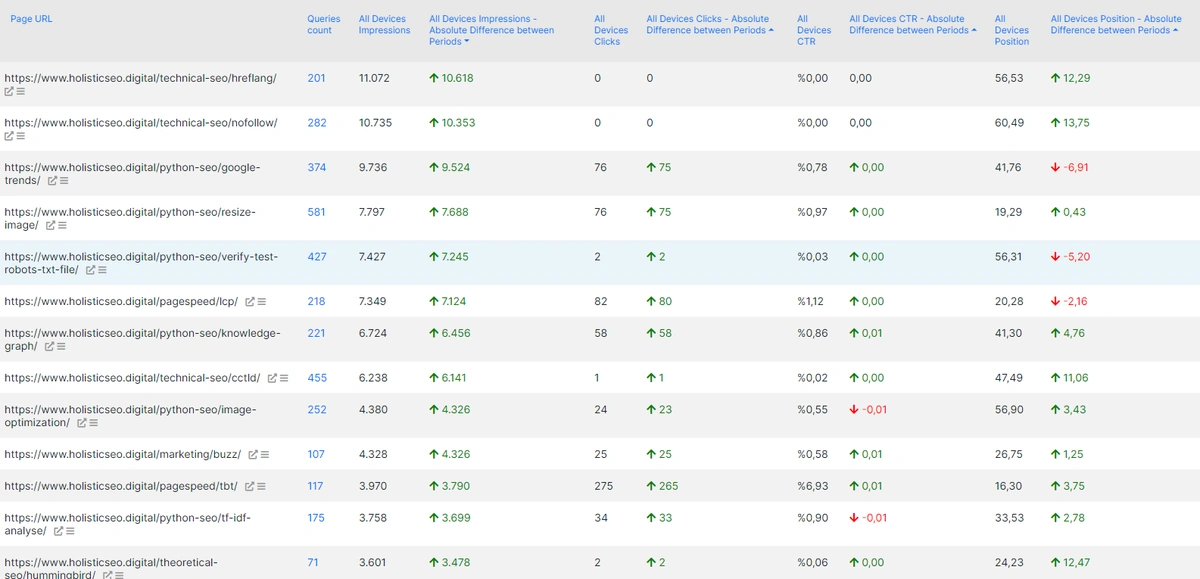 Only the first column has changed from pages to keywords. Now, we see every page for every query with their own performance changes and overall situation.