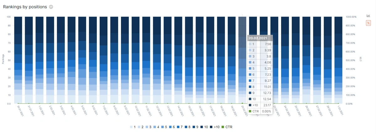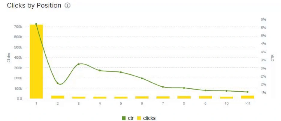 In this section, you can see how many clicks are produced at which rank of the SERP with which Click Through Rate (CTR). And, in the example below, we have a higher CTR at the 3rd rank than in the second rank. Also, we see that there is no big difference in terms of CTR between 3rd, 4th and 5th ranks on the SERP.