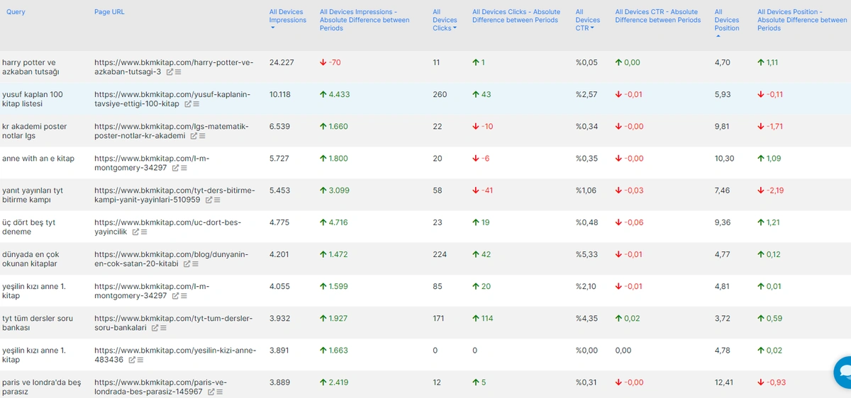 It says âAll Devices % Impressionsâ change means that take the queries (and pages for these queries) or queries according to their impression change for the previous period. In this example, I have filtered queries that have an impression change bigger than 30% while still losing in terms of CTR. Thus, we can find all the problematic areas or SEO organic visibility quick win opportunities in a source.