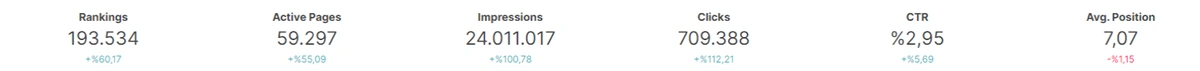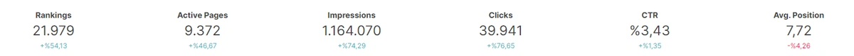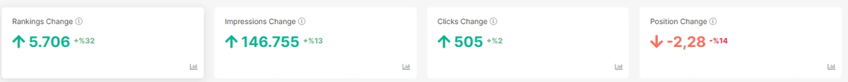 Above, you see a quick performance comparison card at the above section. For this example, we have %32 more queries we have ranked for with the sum of 5.706. And, we also see the click, impression and position changes with their end situation.