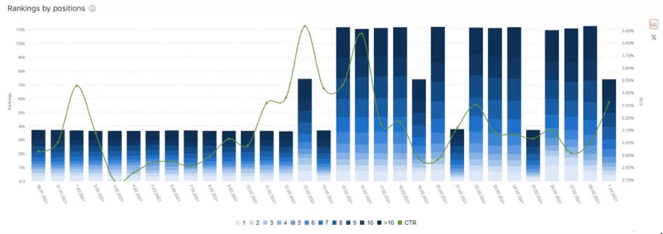 Rankings by Position section of the GSC Module of JetOctopus completes the Clicks by Position data. It shows that this site has lots of queries that it doesnât rank in the first 10 queries. And, we know that this site creates 820.707 clicks at the queries at first rank from the Clicks by Position graph. In this section, we also see that it has 12.419 queries at the first rank with the 5.15% CTR.