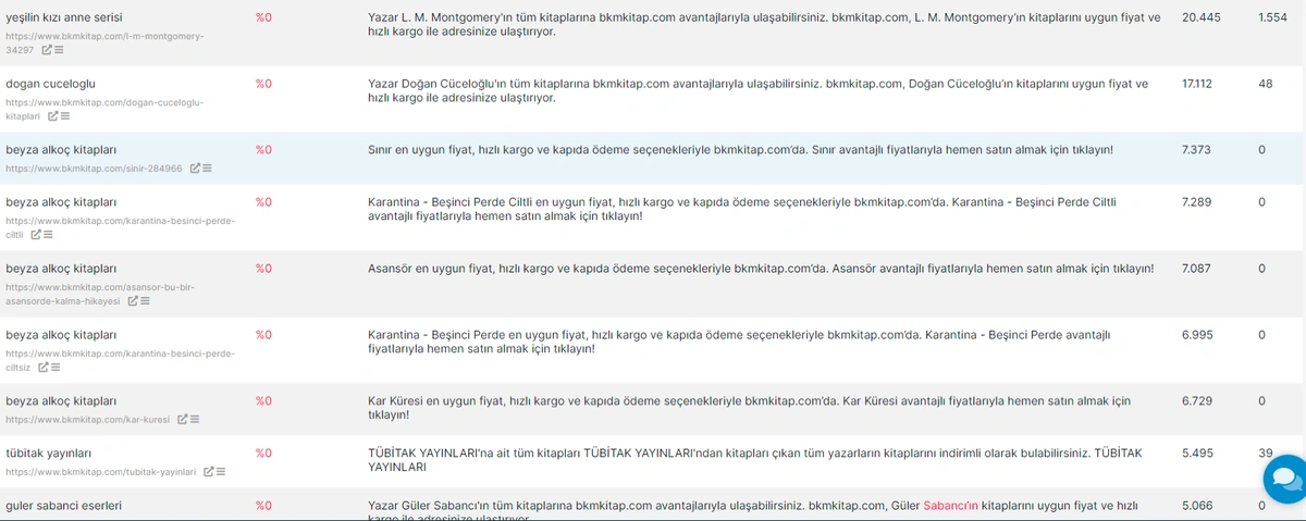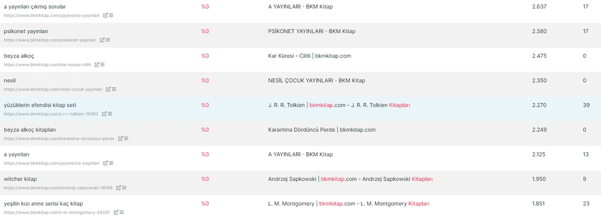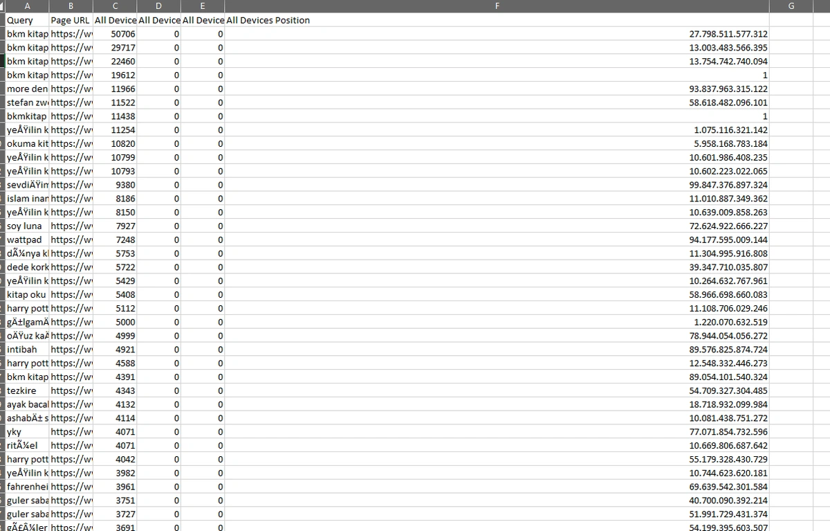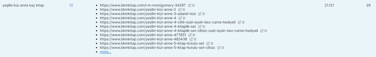This time, the index column (first column) includes the URLs, the second column includes the queries that the specific URL has ranked, product impression but didnât any click from. Thus, by clicking these queries, you can examine them to understand the general pattern of this situation. Below, you will see a filtering example.