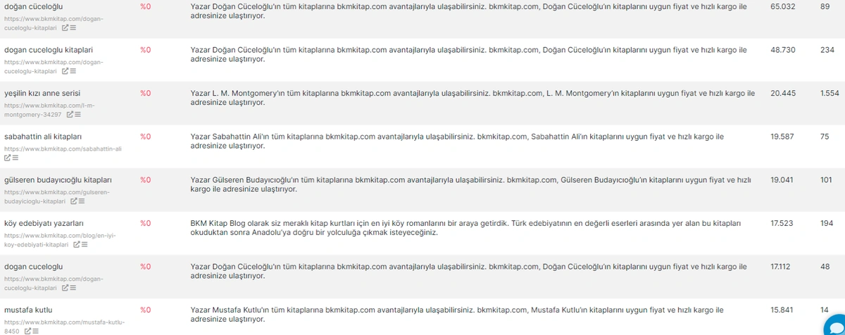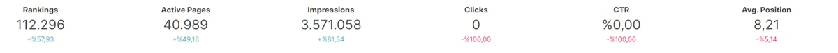 We have 112.296 queries that have produced 3.571.058 impressions but zero clicks. A note should be taken here, if a source shows 5 pages for a query, but only one of these pages take the click, it means that this query is a âZero Click Keywordâ for other 4 pages. Thus, in this context, you should know that the source might take the click from these queries, but some certain pages from the same source might not. Thatâs why Zero Click Pages should be used with the âCannibalizationâ section.
