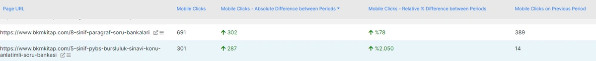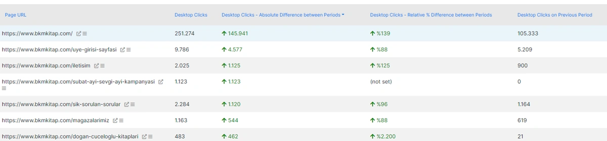 Click data is more definitive than the impressions. Impression is related to the search visibility, clicks are related to the search activity. And, without activity, visibility doesnât have a big value. Thus, checking the winner and loser queries and pages in terms of click data is important. Below, you can see the winner pages in terms of clicks.