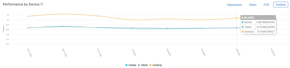 Like in the Quick Performance Observation section, also observing the device-based click, impression, CTR, and Position data is an easy task thanks to JetOctopus. Below, you will see the âImpressionâ performance based on device types for the last 30 days.