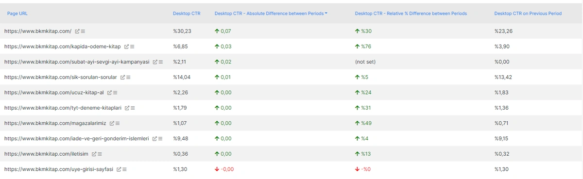CTR Data also can be checked easily for a quick comparison in the context of device, date and pages, queries context. Below, you will see the winner pages in terms of CTR for desktop organic search performance.