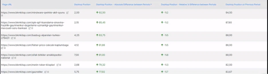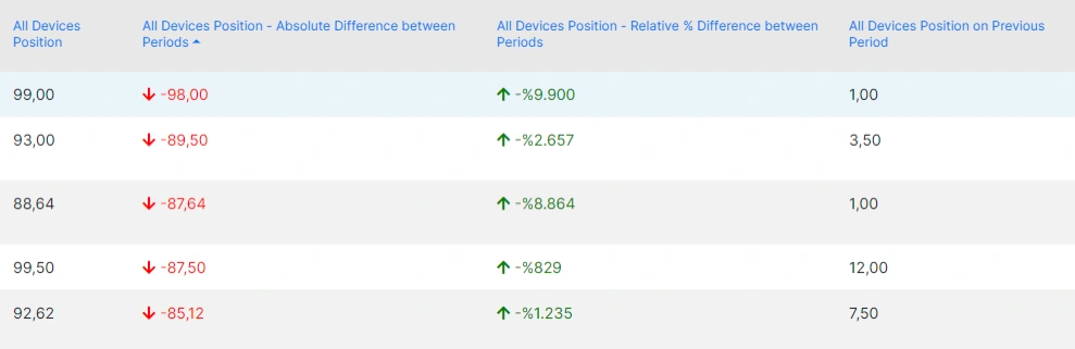 This section is actually a popular filtering option. It collects all the pages and queries according to their position data for the previous and current period.