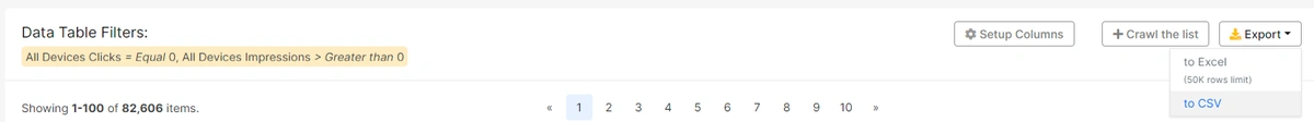 In the All Keywords and Pages Sections, you can simply extract all the data, or you can create your own filtered and customized data table to export it.