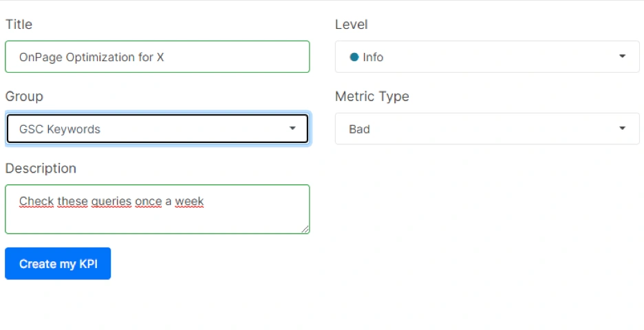 Above, you will see that I am creating a KPI that is called as OnPage Optimization for X at info level for GSC Keywords group with âbad typeâ metric with âCheck these queries once a weekâ warning for myself.