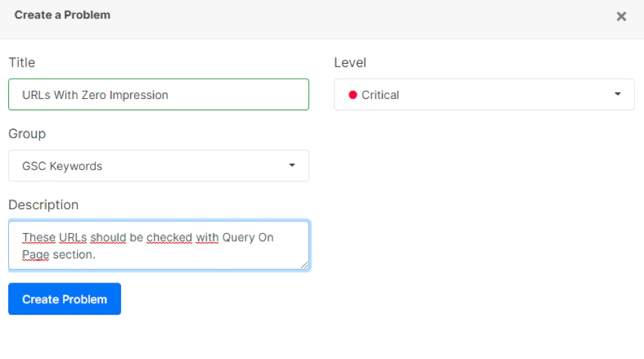 Like in the KPI Option, you can also save something as a problem. For instance, URLs with 0 impression but also in the sitemap or URLs with zero clicks despite more than 10.000 impressions. You can filter these URLs and record them as a problem for a quick analysis or audit later.