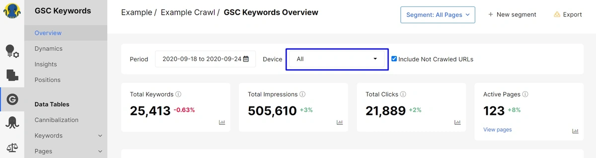 1. By default, JetOctopus shows you a total summary of data of all devices and analyzes how your site performs in SERP in general.