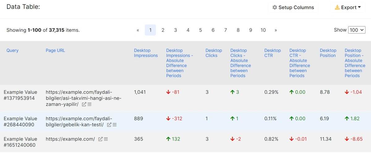 3. Now go to the Datatable and look for particular Keywords/ Pages in SERP that bring you traffic to see how to optimize your tags and content for mobile/desktop devices as shown in the following table: