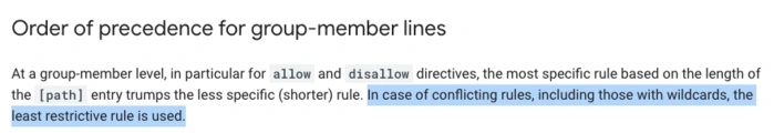 The path value in robots.txt is used as a basis to determine whether or not a rule applies to a specific URL on a site. In the case of conflicting rules, the least restrictive rule is used. Here is the case study when an incorrect order of precedence in robots.txt opened access to duplicated content.
