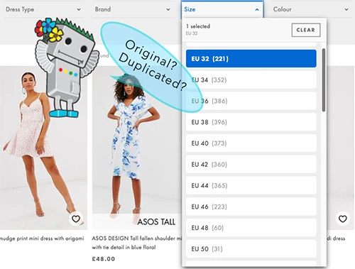 Let’s move on. E-commerce sites provide different paths to similar content. URL parameters for sizes, colors, brands, etc. generate thousands of duplicated pages. Here is the in-depth guide on e-commerce duplicate content