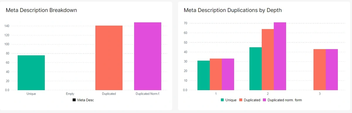 You can also estimate the scale of unique, empty, duplicated descriptions, their DFI in clicks from the main page, see the most duplicated description on visual charts in the Crawl – HTML.