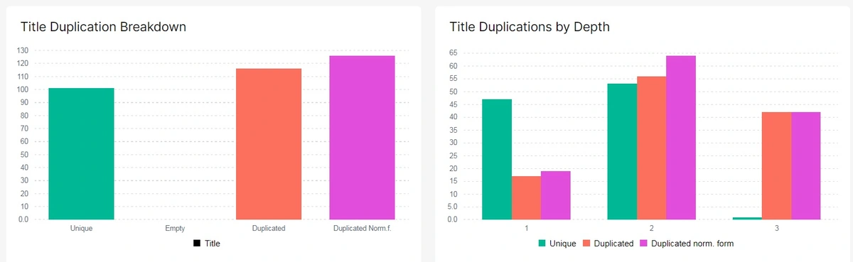You can also estimate the scale of unique, empty, duplicated titles, their DFI in clicks from the main page, see the most duplicated titles on visual charts in the Crawl – HTML.