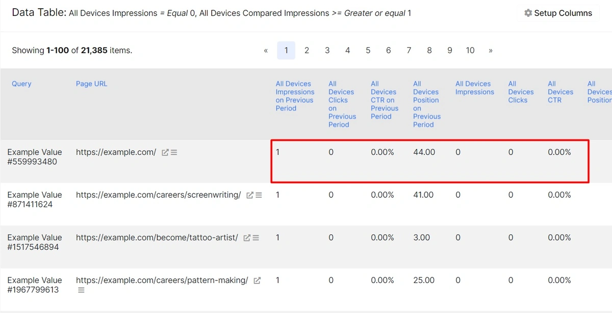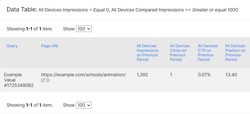 You get to the Datatable containing specific users’ queries which used to bring impressions to your pages but do not anymore.