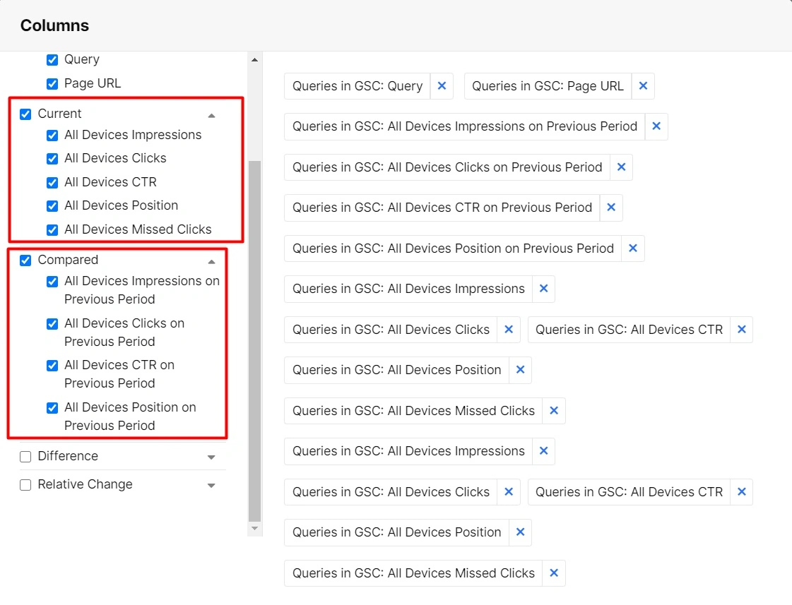 In Setup columns choose queries that you need to check out: Current and Compared.