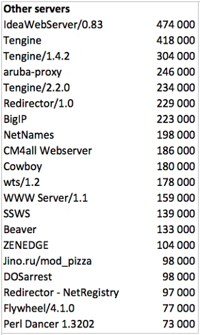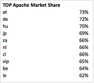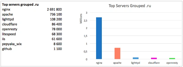 Here we can see that the absolute leader is Nginx and Apache has a share three times less.