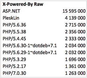 Only 57.3 mln hosts have X-Powered-By header, that’s somewhere 27% of all the “alive” domains.