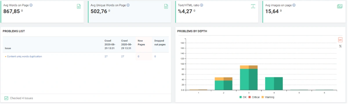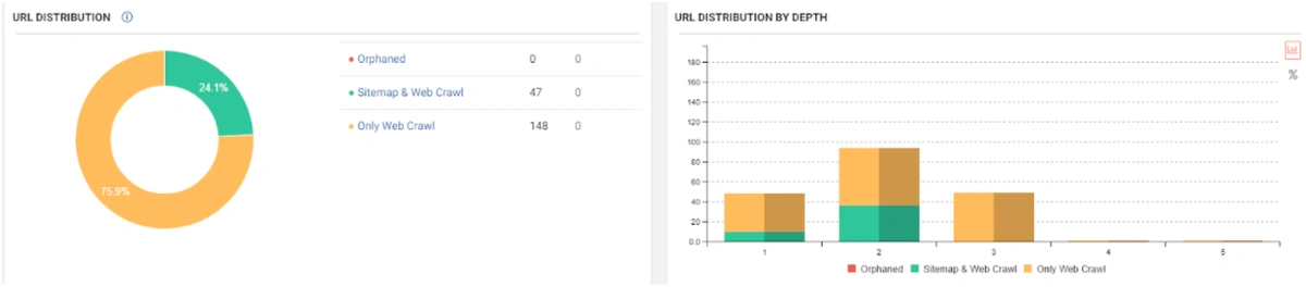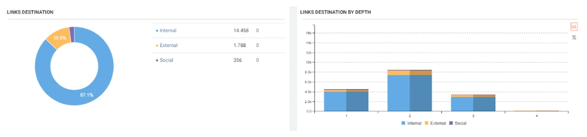 JetOctopus can classify the links in the web entity according to their “destination” and the click depth of “destinations”. Thus, you can see how many links came from which section to new content created.
