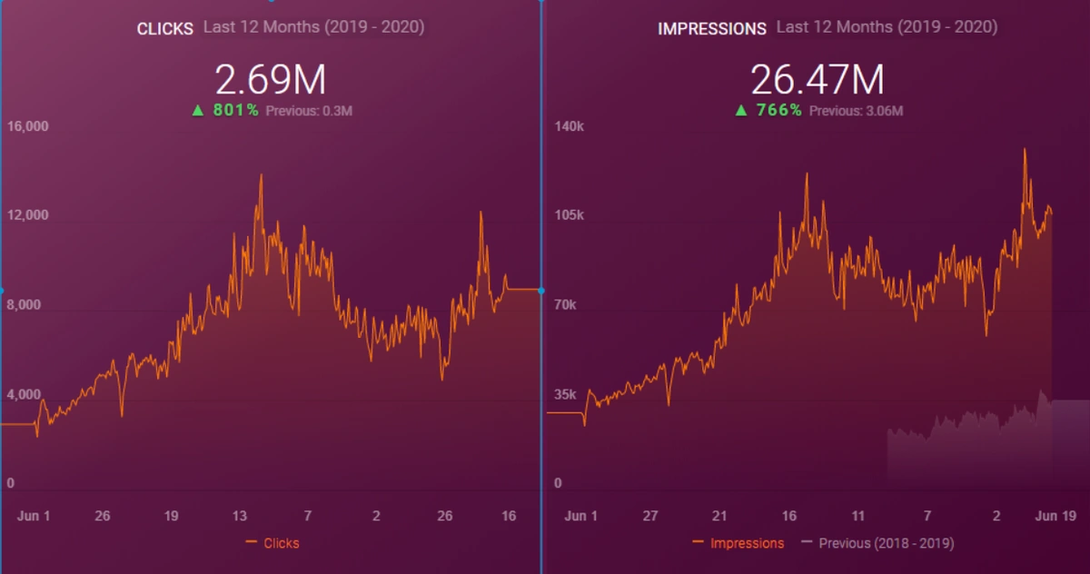 Below you will see the organic traffic increase coming to 300% on an annual basis and how the Ranking Signal Dilution temporarily reduced Organic Traffic in 2020 in a concave form.