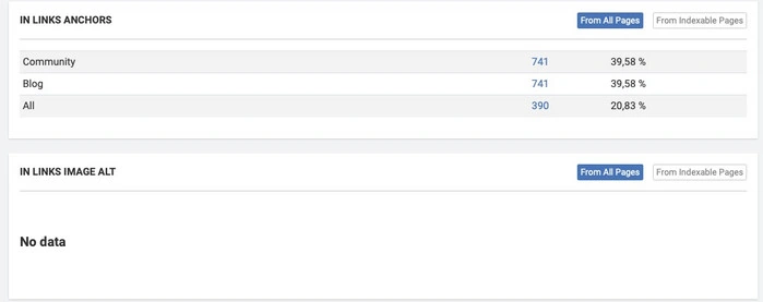 You would like to check a competitor’s anchors or image alt? No problem, with the filter you can also choose from All pages or from Indexible pages.