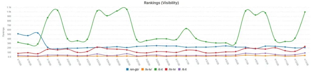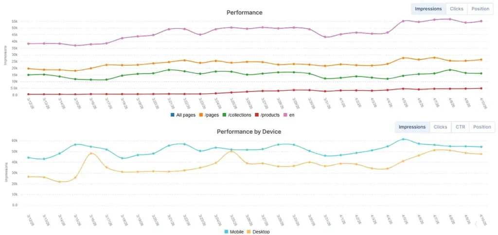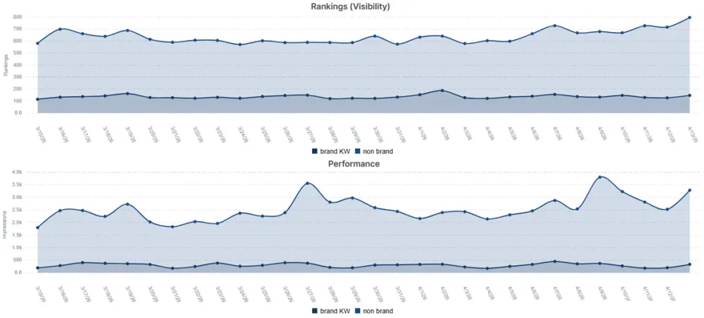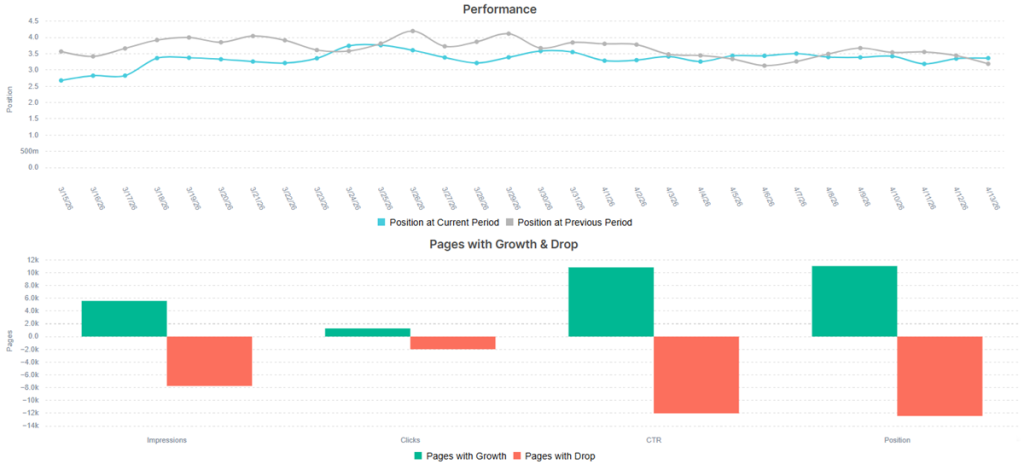 The right way to use keyword rankings: Track rankings as a supporting metric that validates the direction of your Search Visibility (Share of Voice) KPI. Use a representative sample of your most important target keywords to confirm that visibility gains are being driven by the right queries. Pay particular attention to keywords in positions 4–10, as these represent the highest-leverage ranking improvement opportunities – moving from page one’s lower half to the top three has a disproportionate impact on CTR and traffic.