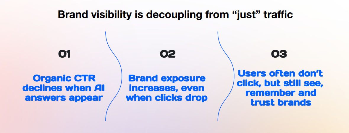 AI changes how users discover and interact with brands. When AI answers appear, organic click-through rates often decline, but brand exposure does not necessarily decrease.