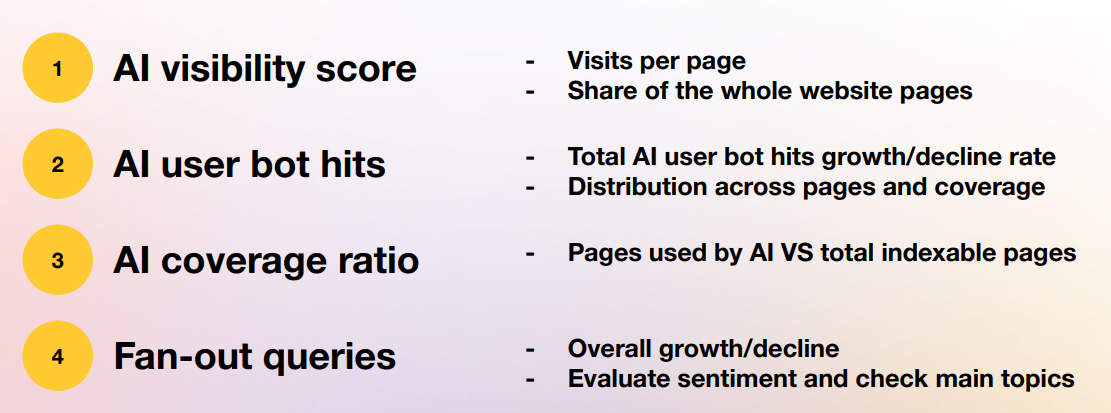 AI user-bot visits can be interpreted as a proxy for impressions within AI interfaces. When analyzed at the URL level, this data reveals which content AI systems rely on and where optimization opportunities exist.