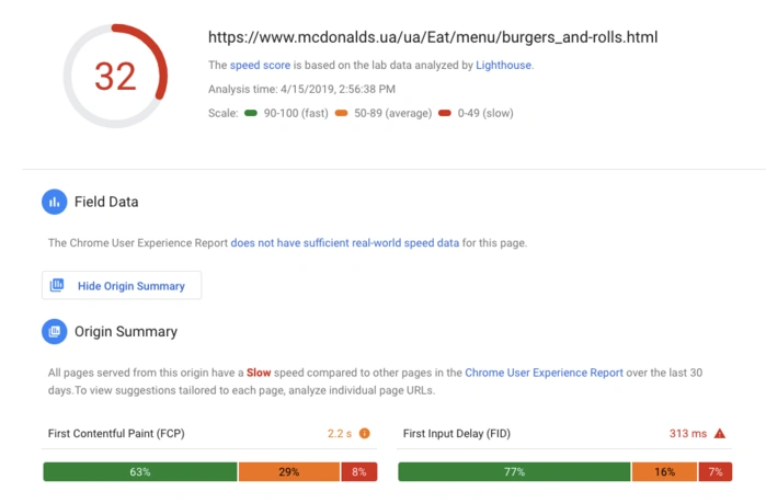 SRT is the amount of time it takes for the web browser to receive a response. According to Google’s PageSpeed Insights, your server response time should be under 200ms. Look at the PageSpeed Insights of MacDonalds’ webpages:
