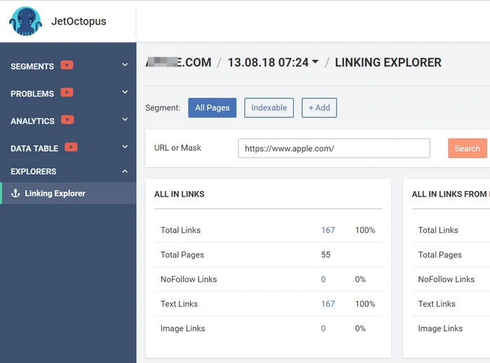 This tool can work in segments mode on the website. For example: you create a segment “Cell phones” (URL contains “cell phone”). Staying in this segment Linking Explorer will show you the information on the links to the landing page exclusively from this segment.