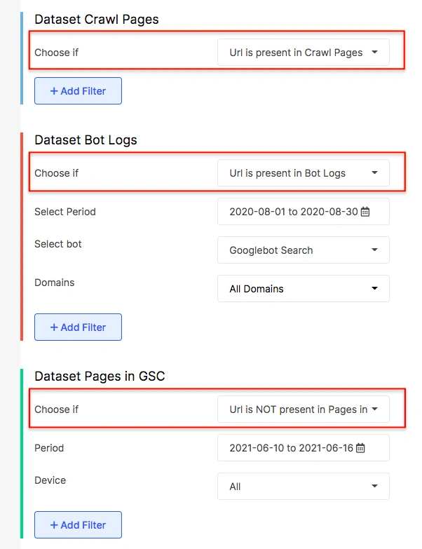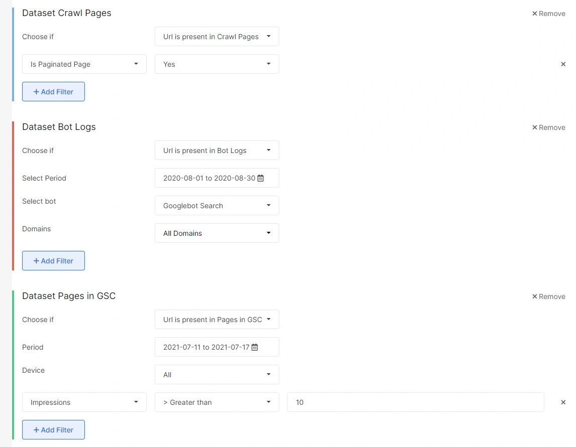 The tool has many datasets like the log data, crawl data, Google Search Console data, Google Analytics data, and more to compare and select pages with over 120 different filters of URL, canonical, redirects, pagination, lang, mobile, technical, JS performance, indexation, content, duplications, system hashes, links, meta, etc. to work with.
