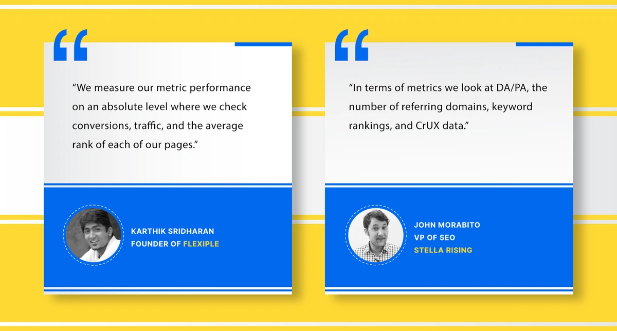 “We measure our metric performance on an absolute level where we check conversions, traffic, and the average rank of each of our pages,” says Karthik Sridharan, Founder of Flexiple.