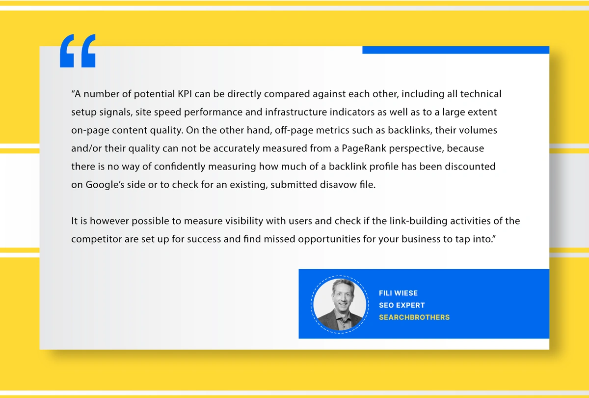 “A number of potential KPI can be directly compared against each other, including all technical setup signals, site speed performance and infrastructure indicators as well as to a large extent on-page content quality. On the other hand, off-page metrics such as backlinks, their volumes and/or their quality can not be accurately measured from a PageRank perspective, because there is no way of confidently measuring how much of a backlink profile has been discounted on Google’s side or to check for an existing, submitted disavow file.”