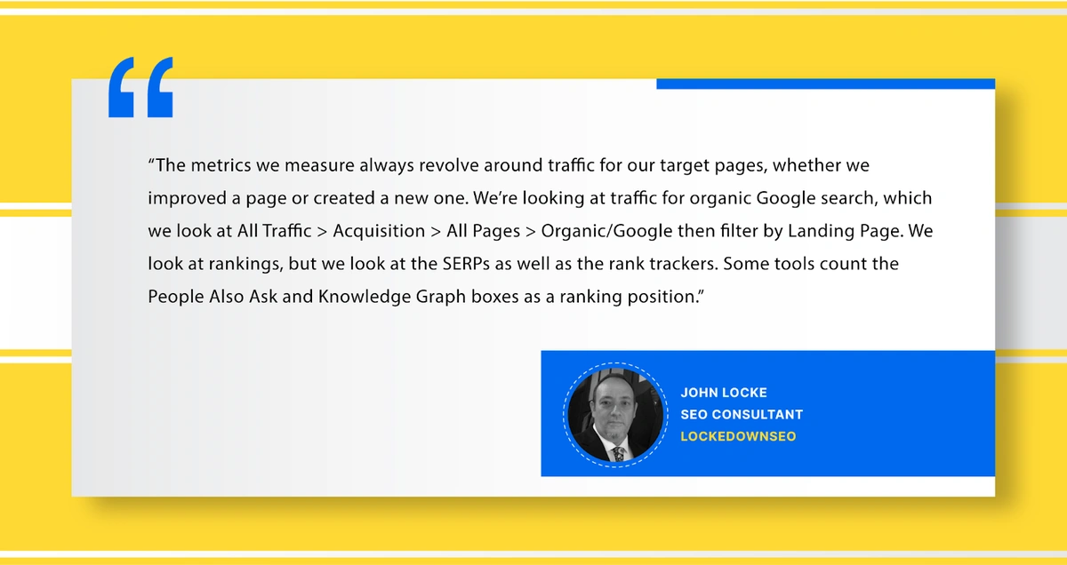 “The metrics we measure always revolve around traffic for our target pages, whether we improved a page or created a new one. We’re looking at traffic for organic Google search, which we look at All Traffic > Acquisition > All Pages > Organic/Google then filter by Landing Page. We look at rankings, but we look at the SERPs as well as the rank trackers. Some tools count the People Also Ask and Knowledge Graph boxes as a ranking position.”