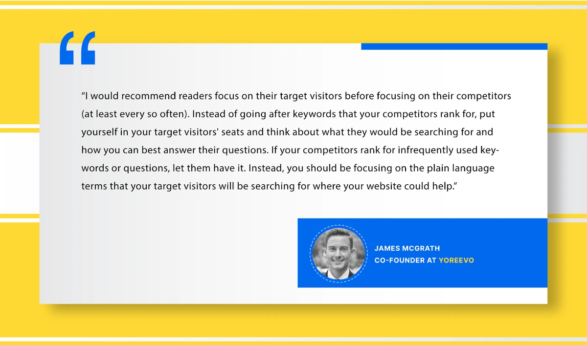 “I would recommend readers focus on their target visitors before focusing on their competitors (at least every so often). Instead of going after keywords that your competitors rank for, put yourself in your target visitors’ seats and think about what they would be searching for and how you can best answer their questions. If your competitors rank for infrequently used keywords or questions, let them have it. Instead, you should be focusing on the plain language terms that your target visitors will be searching for where your website could help,” advises James McGrath, Co-Founder at Yoreevo.
