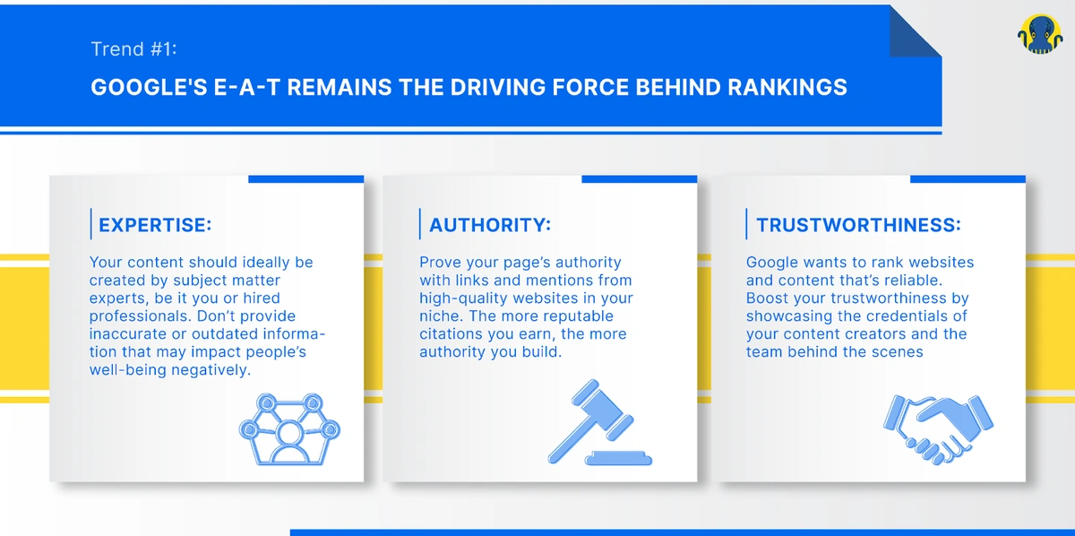 “The leading SEO trend in 2022 will continue to be E-A-T. I know I sound like a broken record, but E-A-T is the driving force behind what makes sites rank in recent years, especially on YMYL (your money, your life) topics,” corroborates Lily Ray, Sr. Director, SEO & Head of Organic Research at Amsive Digital.