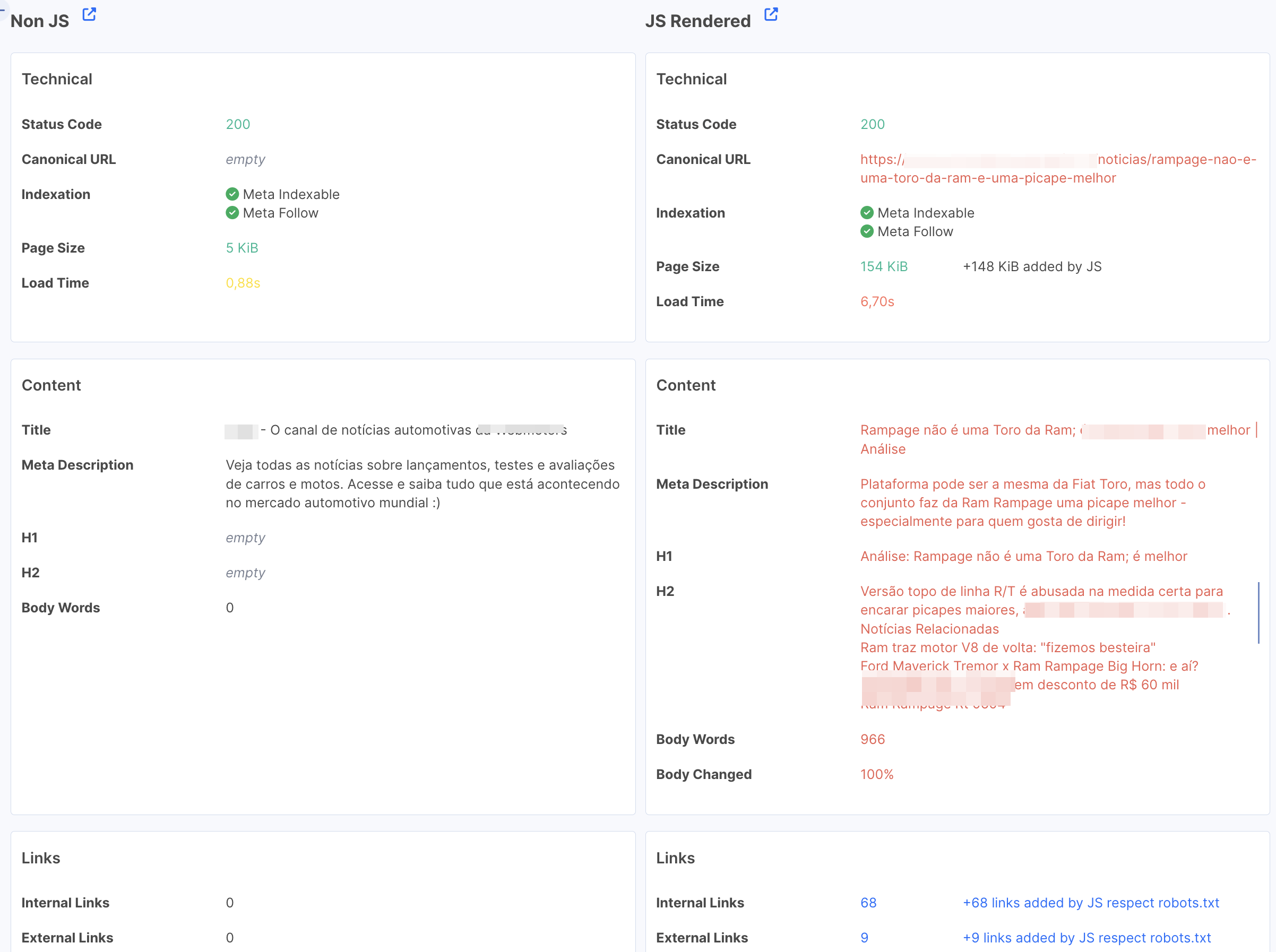 The following key elements are present and consistent in SSR HTML and rendered JS: – <title> – meta description – meta robots – canonical, hreflang (if used) _ <h1> – main content / key product information – internal links (navigation, breadcrumbs, related items) – structured data