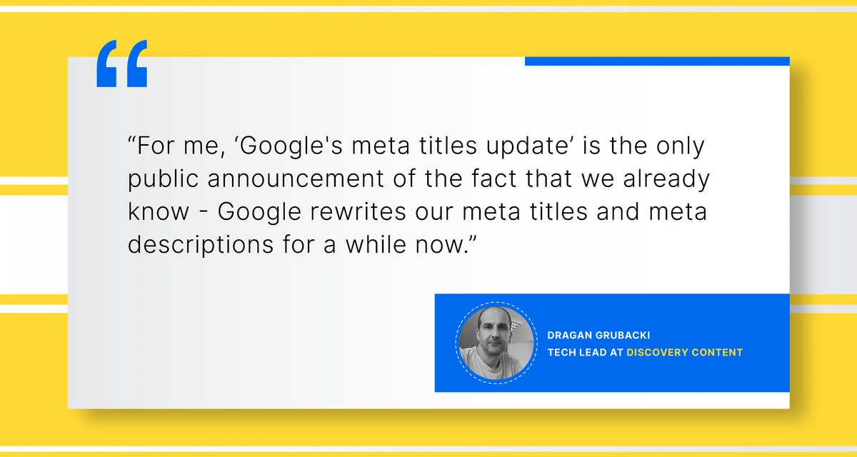 “For me, ‘Google’s meta titles update’ is the only public announcement of the fact that we already know – Google rewrites our meta titles and meta descriptions for a while now. This happens when we (in Google’s opinion) miss the title based on the content or the content does not reflect our desired title tag. Changes are almost always very small and on the point. This is not a big problem at all, similarly to personalized search results, we need to get accustomed to the fact that each searcher might not see the same title,” explained Dragan Grubacki, Tech Lead at Discovery Content.